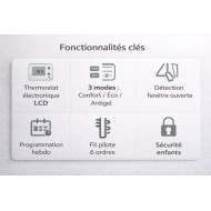 Cet appareil dispose d'un Chrono-thermostat électronique et d'un écran LCD rétro-éclairé bleu. Ce radiateur offre plusieurs fonctionnalités permettant un grand confort d'utilisation : avec 6 pilotes de programmation quotidienne et hebdomadaire, une détection fenêtre ouverte. Il a une grande résistance à ailettes pour optimiser le processus de convection de son système, il est équipé d'un limiteur thermique de sécurité en cas de surchauffe et une double carénage latéral, il a un kit de supports de fixation murale. Ce radiateur a une isolation de classe II et une tension de 230 Volt et une fréquence de 50 Herz.